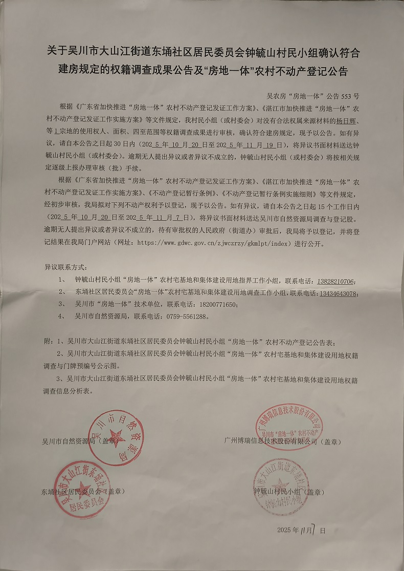 吴川市大山江街道东埇社区居民委员会钟毓山村民小组确认符合建房规定的权籍调查成果公告及“房地一体”农村不动产登记公告