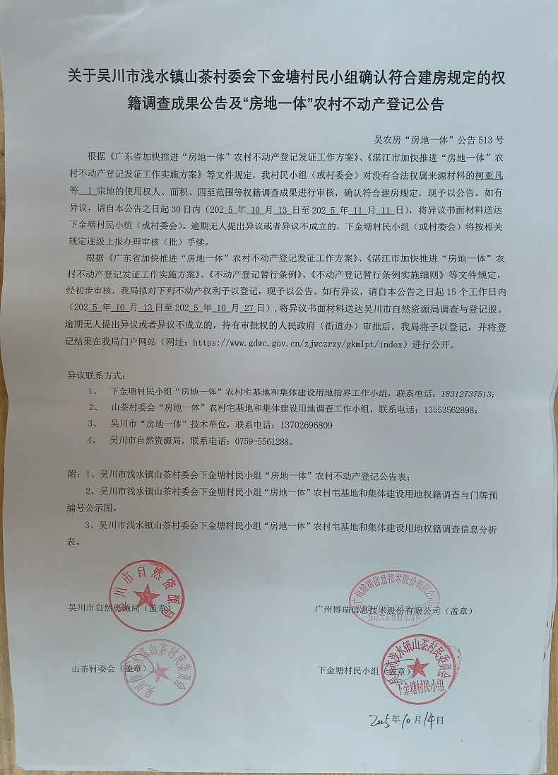 吴川市浅水镇山茶村委会下金塘村民小组确认符合建房规定的权籍调查成果公告及“房地一体”农村不动产登记公告