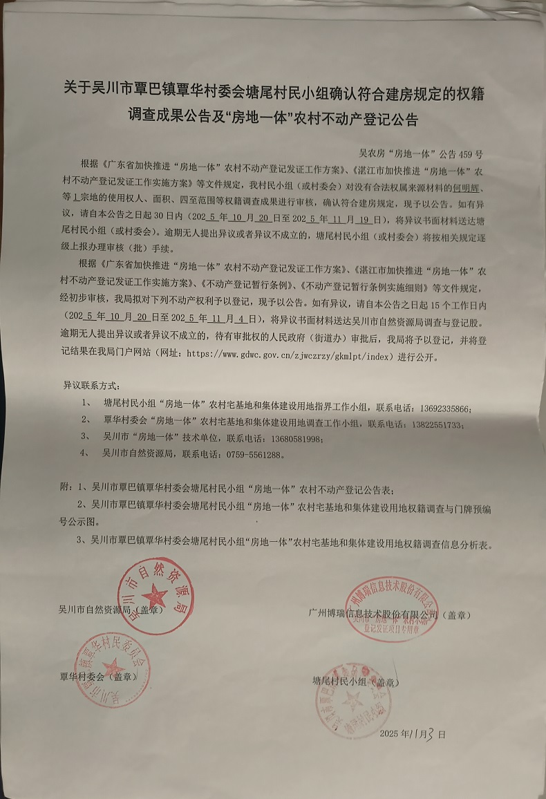 吴川市覃巴镇覃华村委会塘尾村民小组确认符合建房规定的权籍调查成果公告及“房地一体”农村不动产登记公告