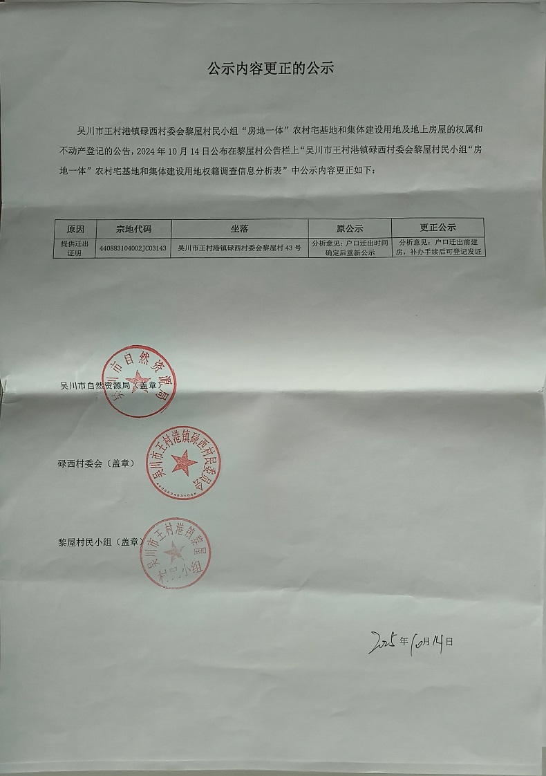 吴川市王村港镇碌西村委会黎屋村民小组公示内容更正的公示