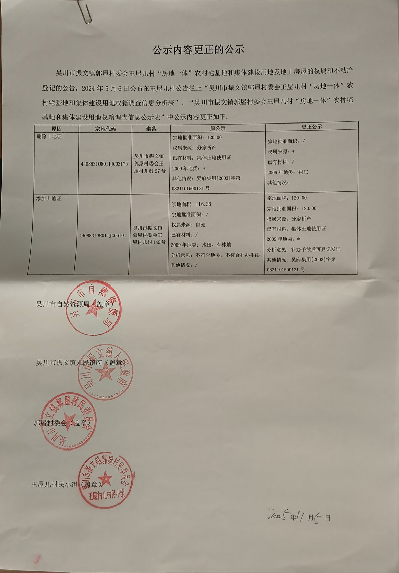 吴川市振文镇郭屋村委会王屋村儿村民小组公示内容更正的公示