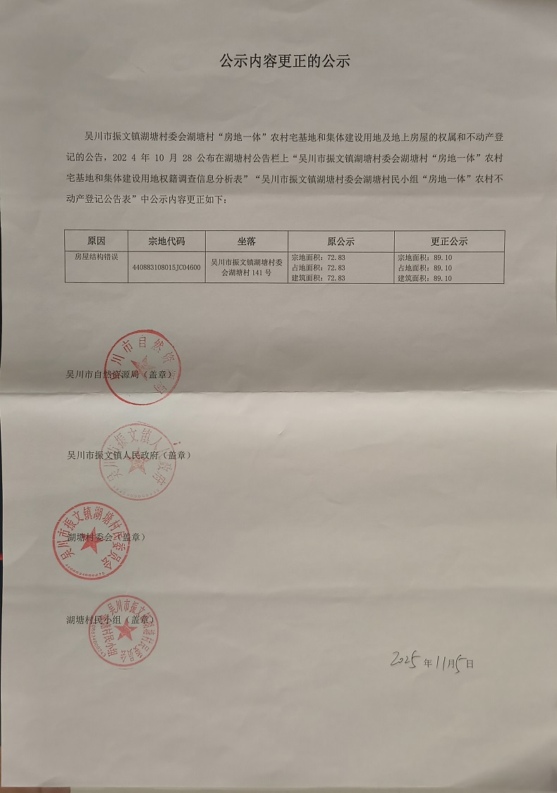 吴川市振文镇湖塘村委会湖塘村民小组公示内容更正的公示