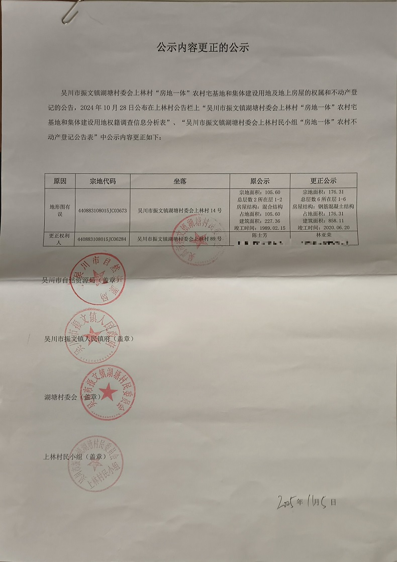 吴川市振文镇湖塘村委会上林村民小组公示内容更正的公示