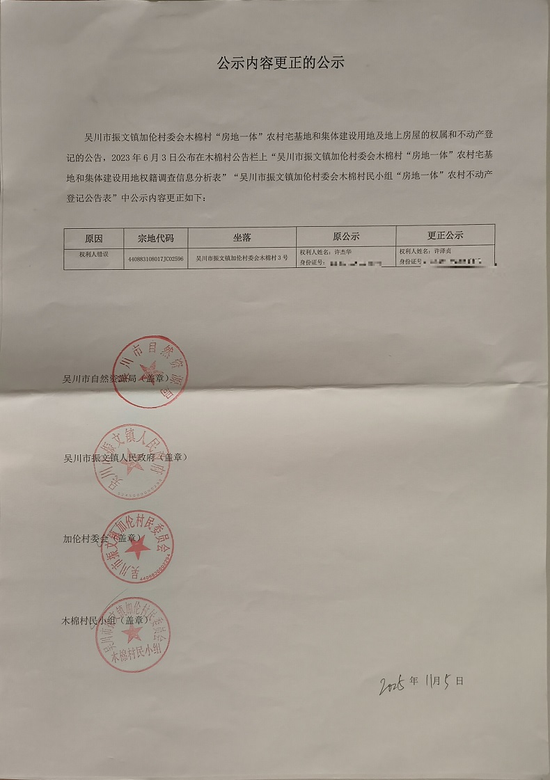 吴川市振文镇加伦村委会木棉村民小组公示内容更正的公示