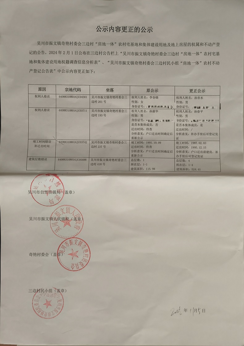 吴川市振文镇奇艳村委会三边村民小组公示内容更正的公示