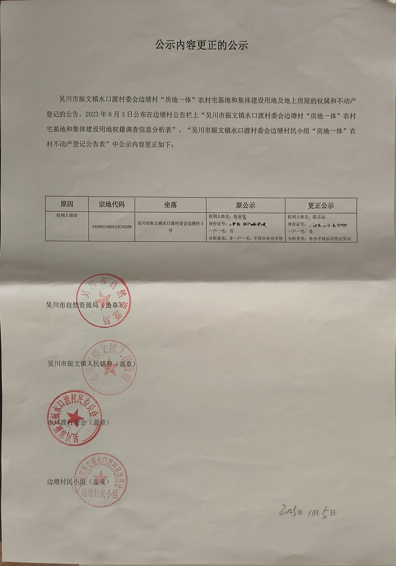 吴川市振文镇水口渡村委会边塘村民小组公示内容更正的公示