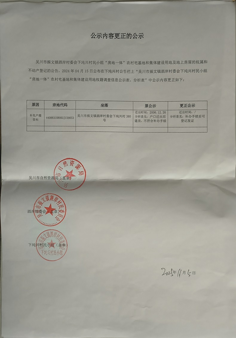 吴川市振文镇泗岸村委会下坉兴村民小组公示内容更正的公示