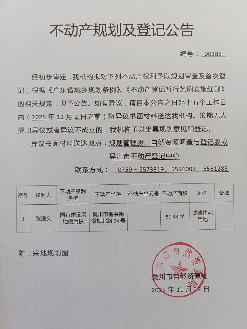 不动产规划及登记公告(张逸文)宗地面积:51.58平方米