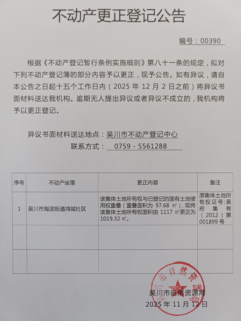 不动产更正登记公告(广东省吴川市海滨街道鸿城社区旧大岭经济合作社)宗地面积:1019.32平方米