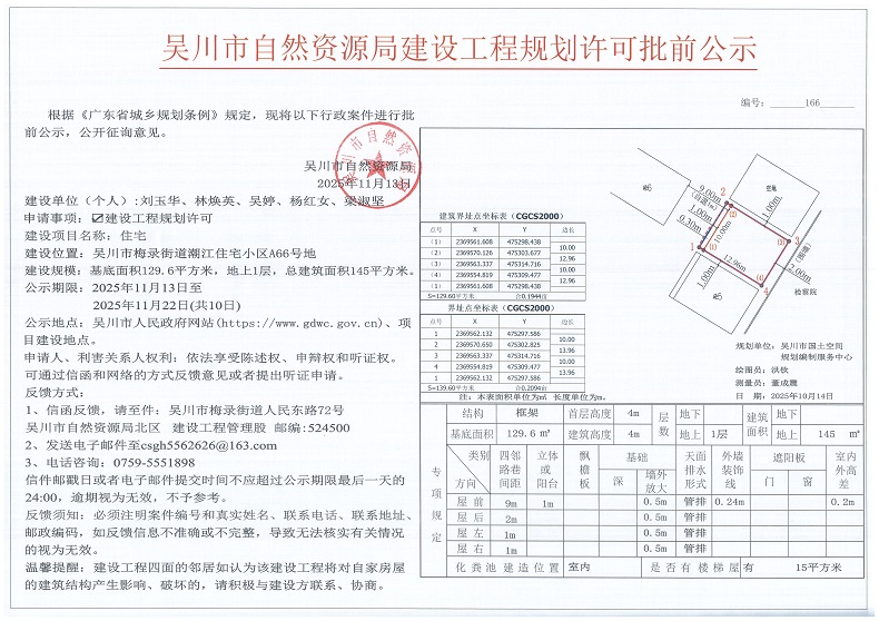 吴川市自然资源局建设工程规划许可批前公示(刘玉华、林焕英、吴婷、杨红女、梁淑坚)