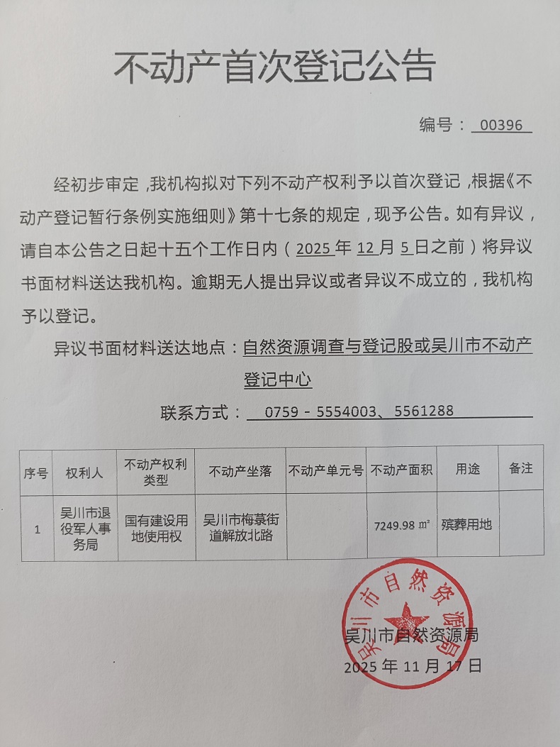 不动产首次登记公告(吴川市退役军人事务局)宗地面积:7249.98平方米