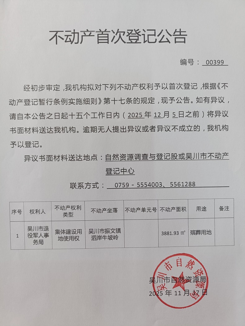 不动产首次登记公告(吴川市退役军人事务局)宗地面积:3881.93平方米
