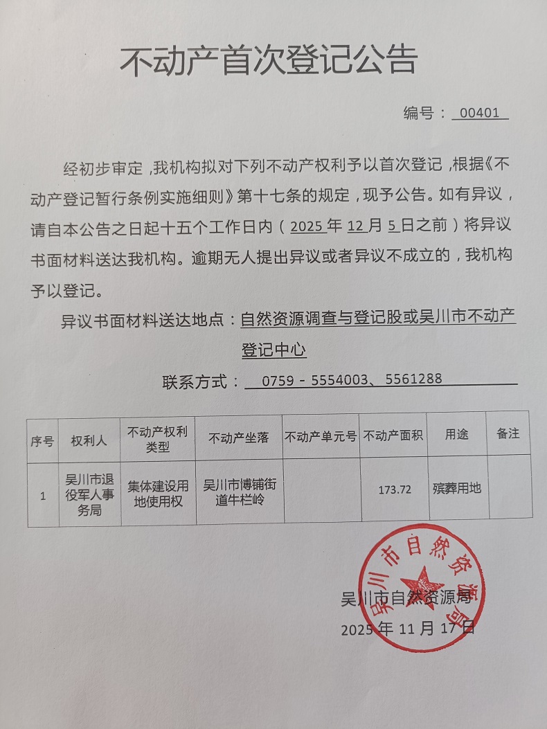 不动产首次登记公告(吴川市退役军人事务局)宗地面积:173.72平方米