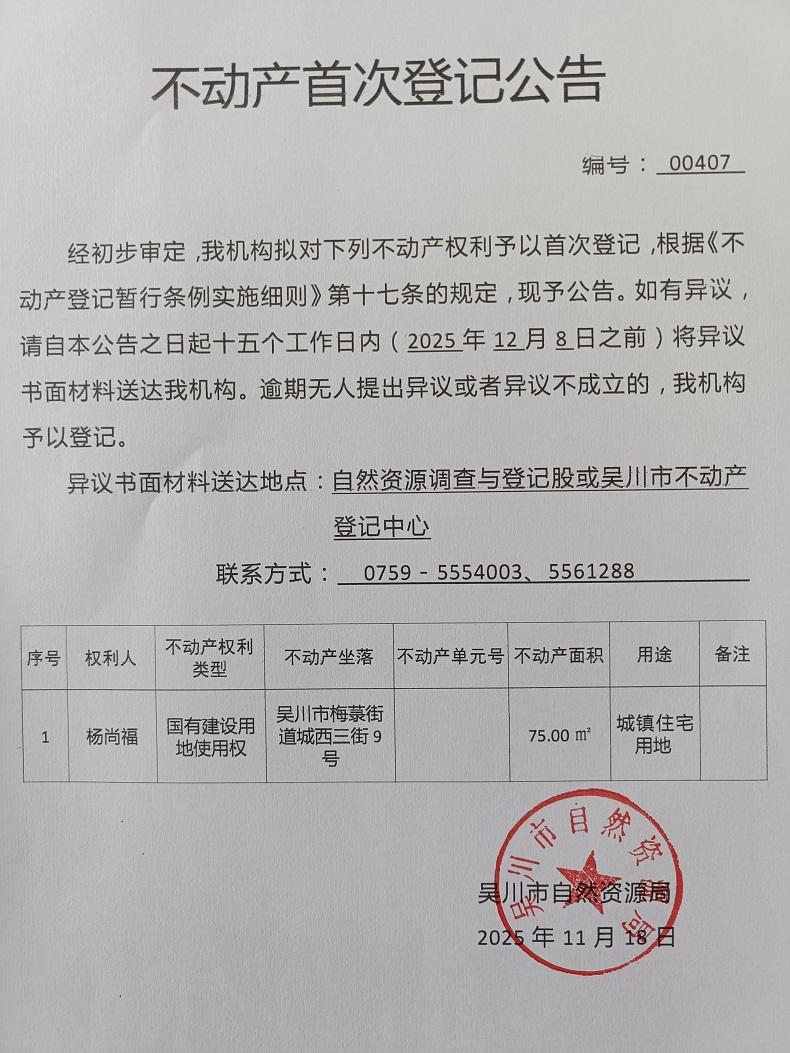 不动产首次登记公告(杨尚福)宗地面积:75.00平方米