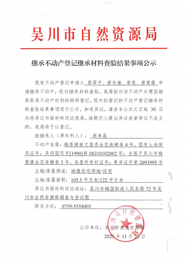 继承不动产登记继承材料查验结果事项公示(廖寿昌)