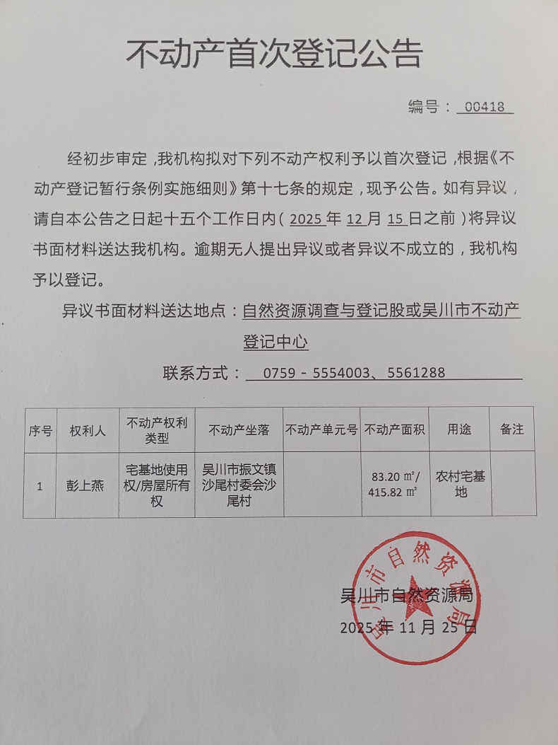 不动产首次登记公告(彭上燕)宗地面积:83.20平方米、建筑面积:415.82平方米