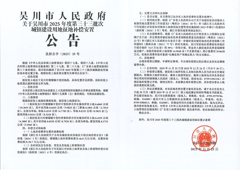 关于吴川市2025年度第三十三批次城镇建设用地征地补偿安置公告