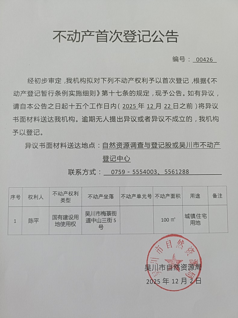 不动产首次登记公告(陈平)宗地面积:100平方米