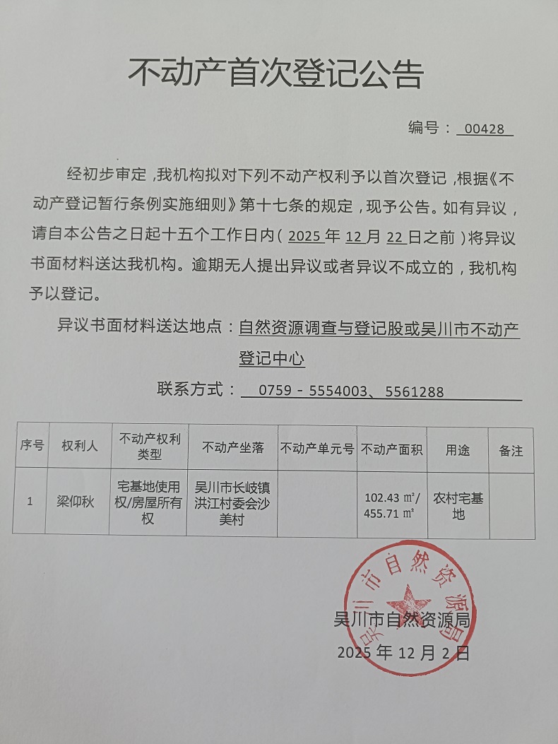 不动产首次登记公告(梁仰秋)宗地面积:102.43平方米、建筑面积:455.71平方米