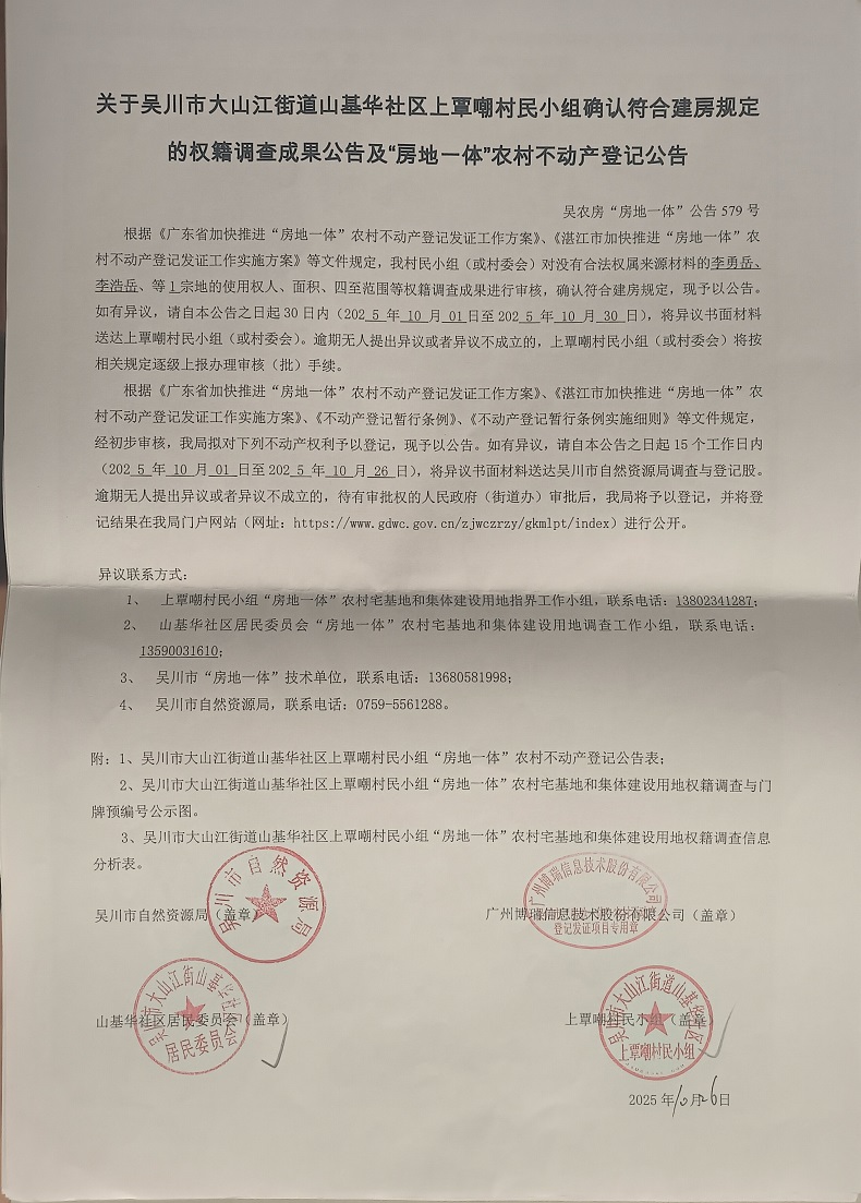 吴川市大山江街道山基华社区上覃嘲村民小组确认符合建房规定的权籍调查成果公告及“房地一体”农村不动产登记公告