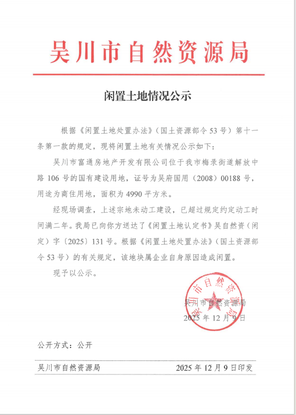 闲置土地情况公示(吴川市富通房地产开发有限公司4990平方米)