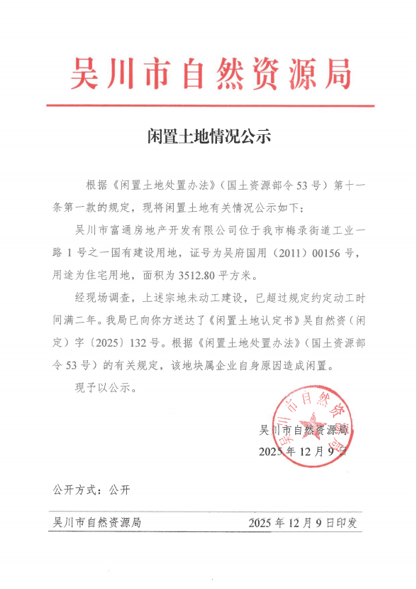闲置土地地情况公示(吴川市富通房地产开发有限公司3512.8平方米)