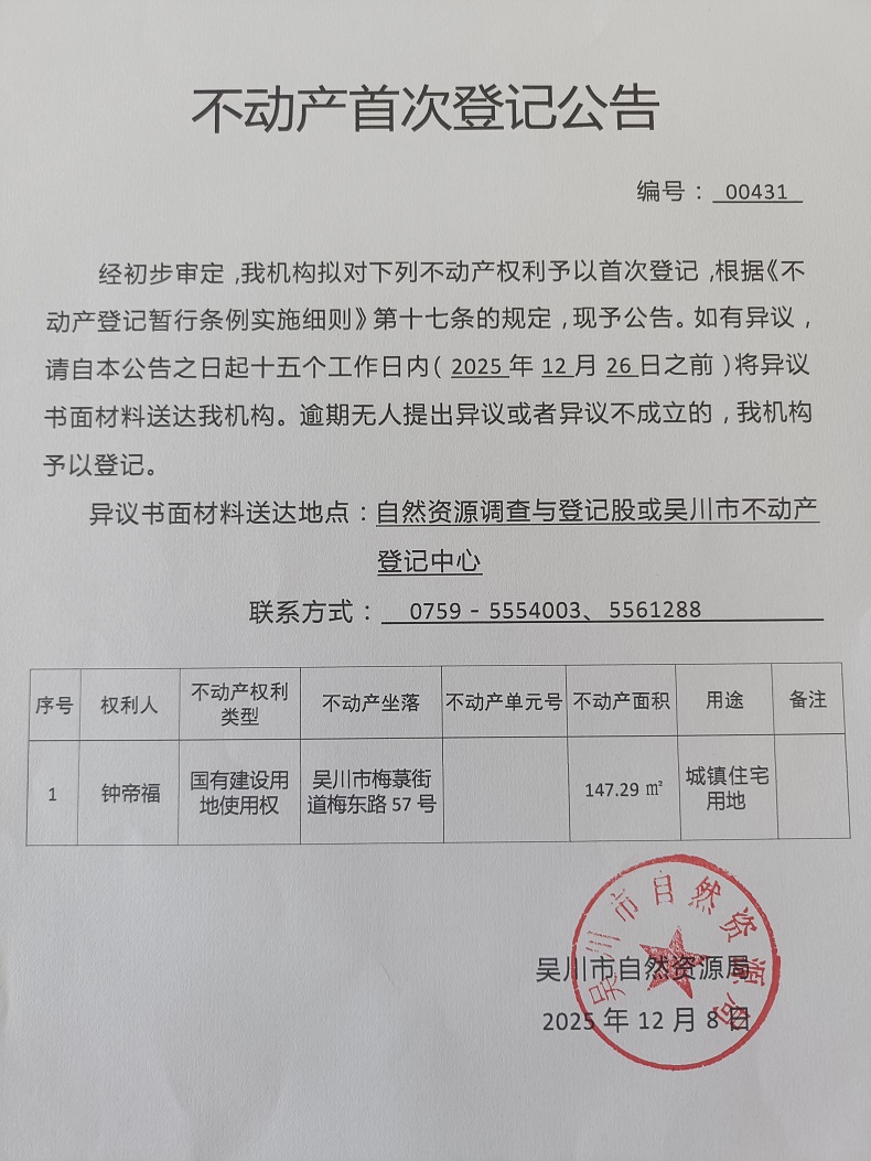 不动产首次登记公告(钟帝福)宗地面积:147.29平方