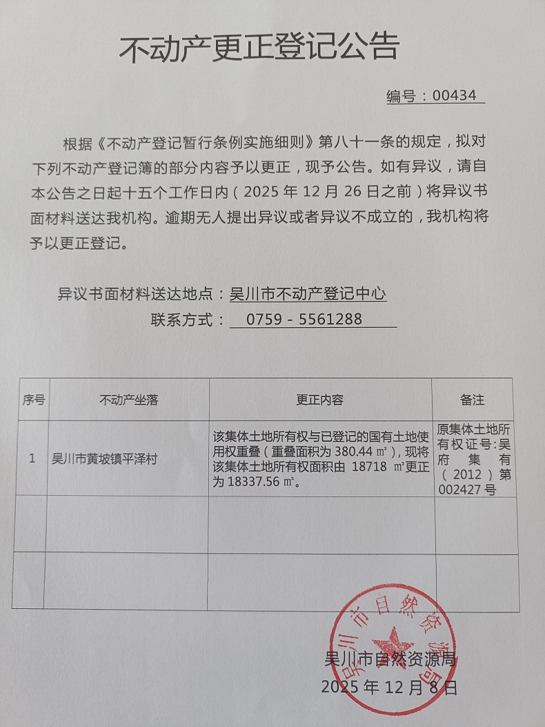 不动产更正登记公告(广东省吴川市黄坡镇平泽村蕉子岭经济合作社)宗地面积:18337.56平方米
