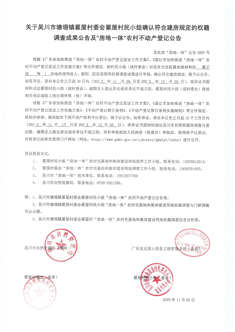 吴川市塘㙍镇翟屋村委会翟屋村民小组“房地一体”农村宅基地和集体建设用地及地上房屋的权属和不动产登记的公告