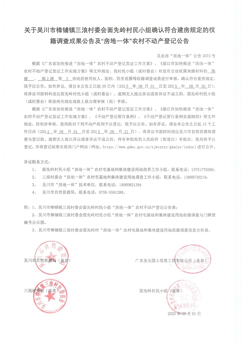 吴川市樟铺镇三浪村委会面先岭村民小组“房地一体”农村宅基地和集体建设用地及地上房屋的权属和不动产登记的公告