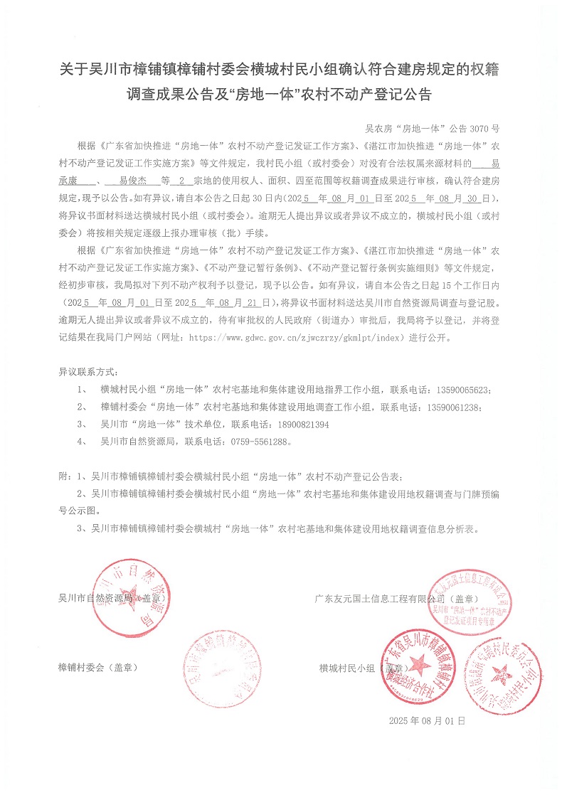 吴川市樟铺镇樟铺村委会横城村民小组“房地一体”农村宅基地和集体建设用地及地上房屋的权属和不动产登记的公告