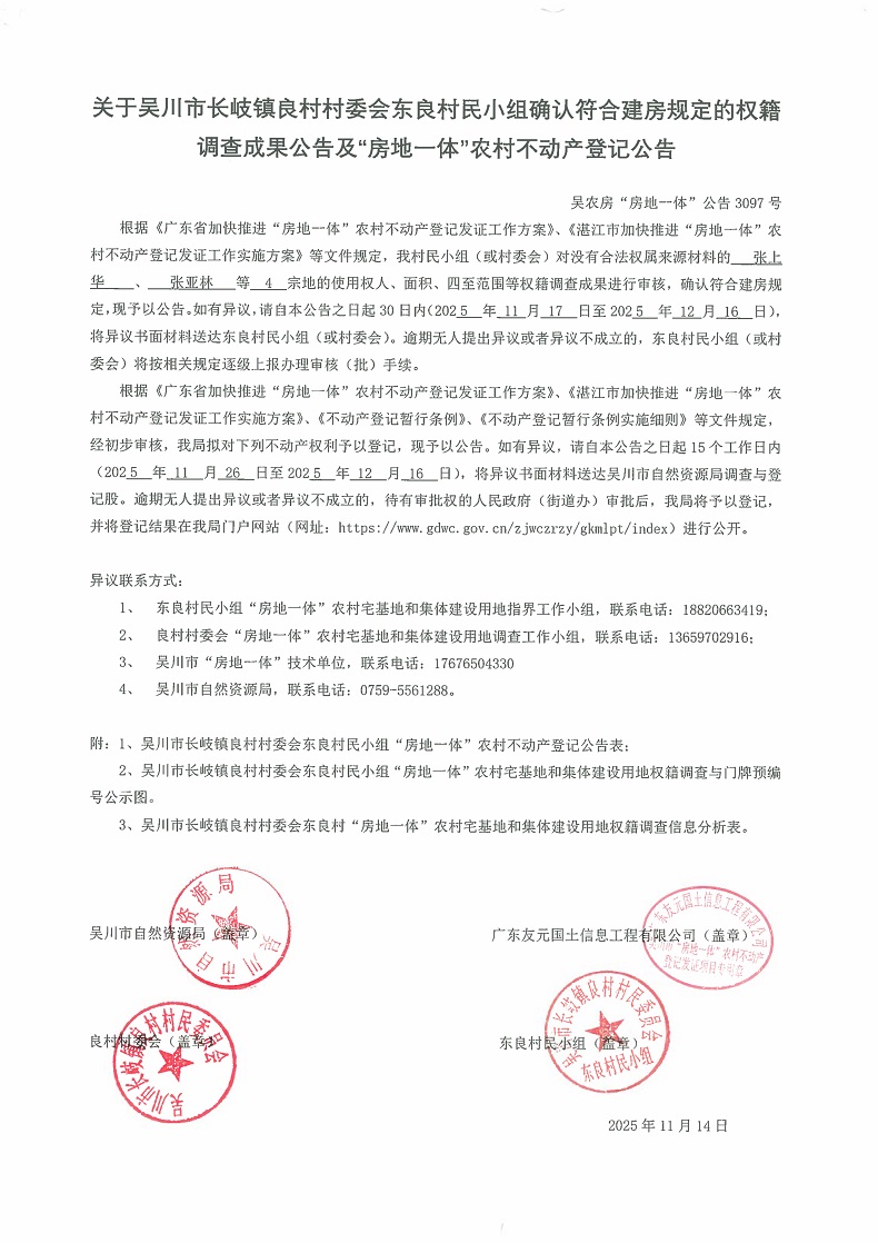 吴川市长岐镇良村村委会东良村民小组“房地一体”农村宅基地和集体建设用地及地上房屋的权属和不动产登记的公告