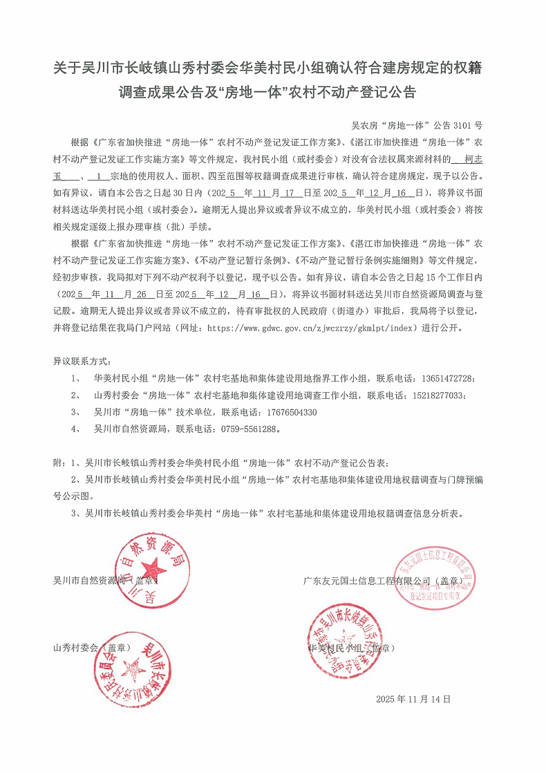 吴川市长岐镇山秀村委会华美村民小组“房地一体”农村宅基地和集体建设用地及地上房屋的权属和不动产登记的公告