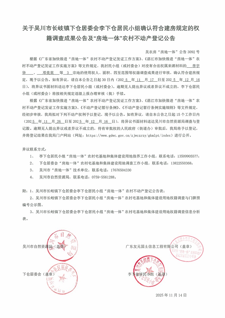吴川市长岐镇下仓居委会李下仓居民小组“房地一体”农村宅基地和集体建设用地及地上房屋的权属和不动产登记的公告