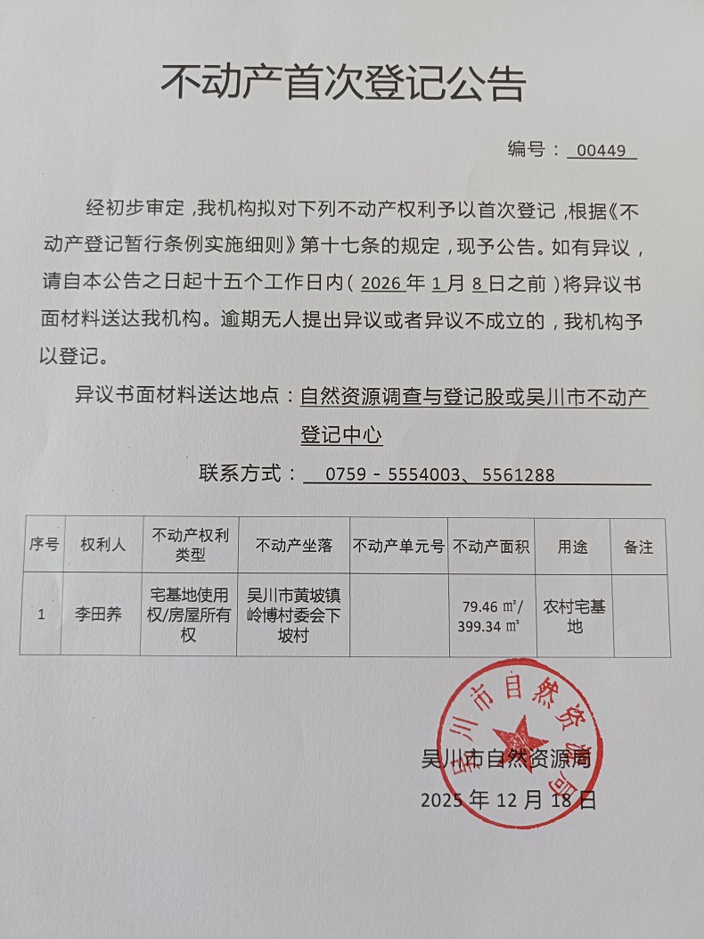 不动产首次登记公告(李田养)宗地面积:79.46平方米、建筑面积:399.34平方米