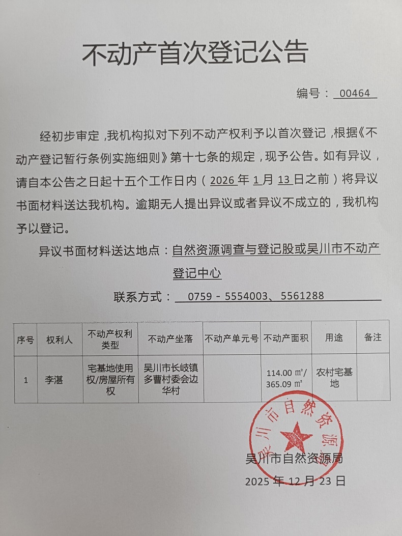 不动产首次登记公告(李湛)宗地面积:114.00平方米、建筑面积:365.09平方米