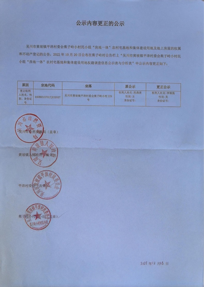 吴川市黄坡镇平泽村委会蕉子岭小村公示内容更正的公示.pdf