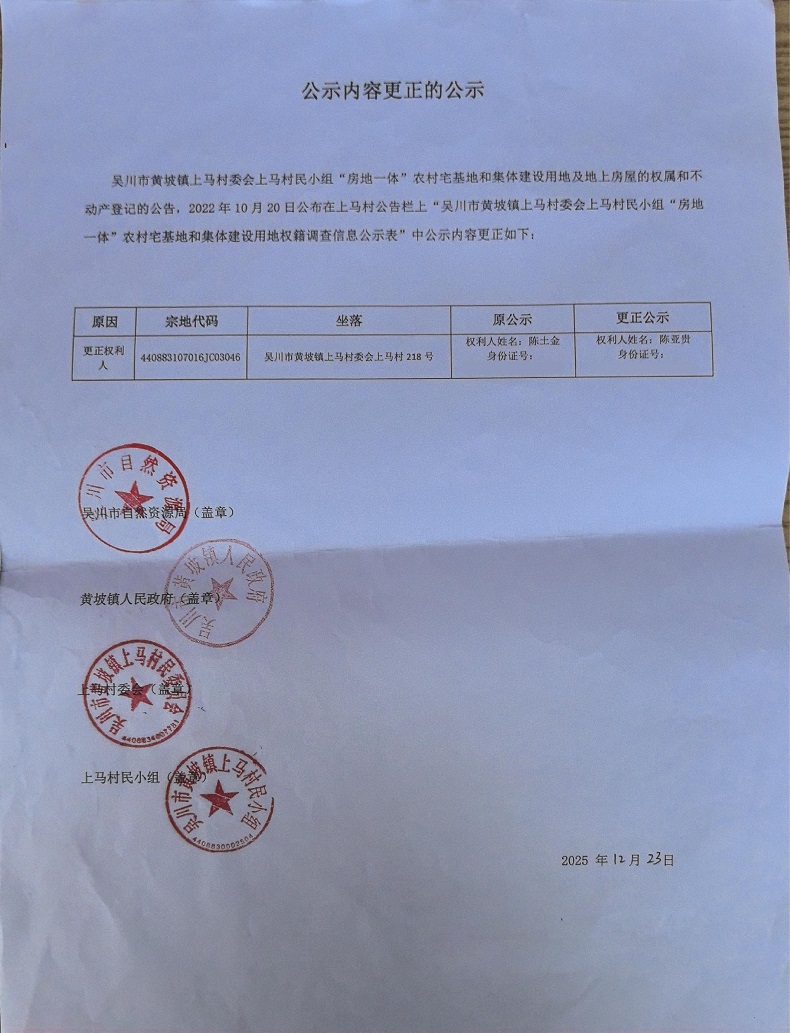 吴川市黄坡镇上马村委会上马村公示内容更正的公示