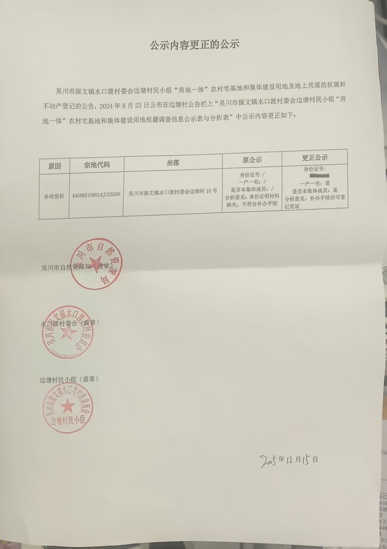 吴川市振文镇水口渡村委会边塘村公示内容更正的公示