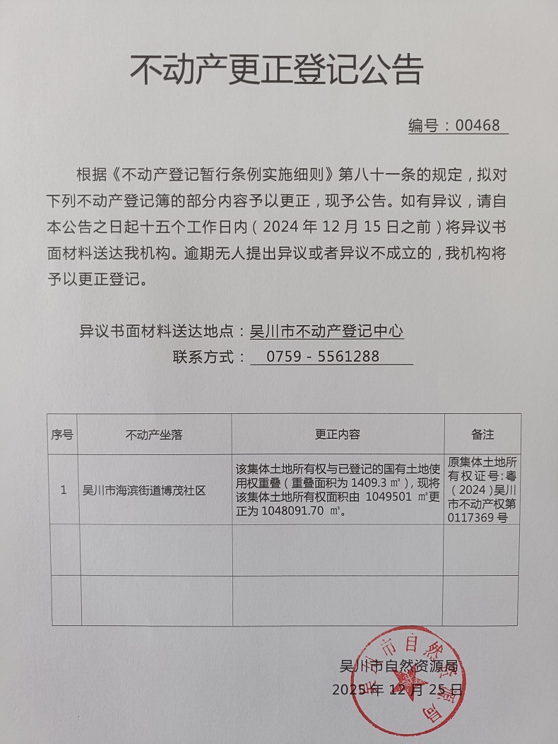 不动产更正登记公告(广东省吴川市海滨街道博茂社区路口、官衙、井头、大庙、清源经济合作社)宗地面积:1048091.70平方米