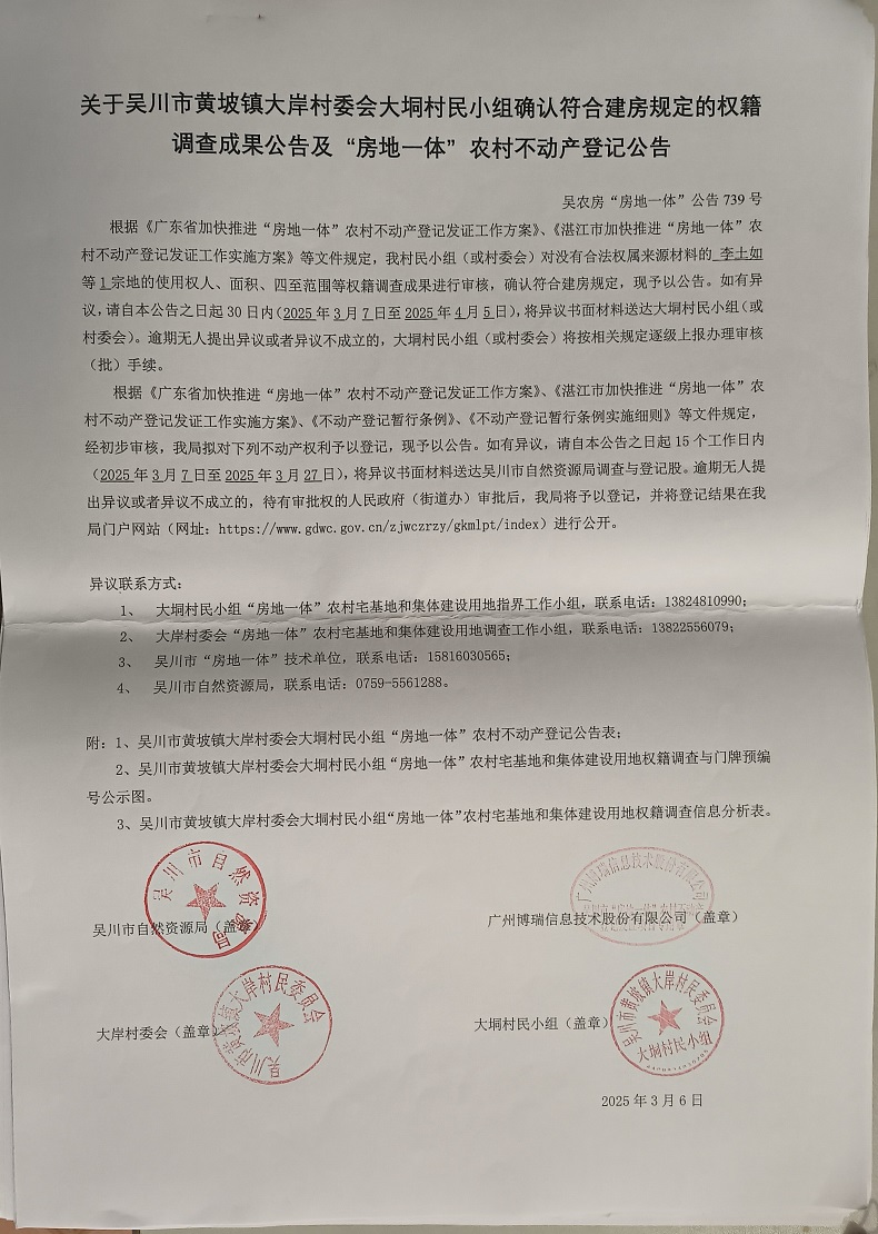吴川市黄坡镇大岸村委会大垌村民小组确认符合建房规定的权籍调查成果公告及“房地一体”农村不动产登记公告