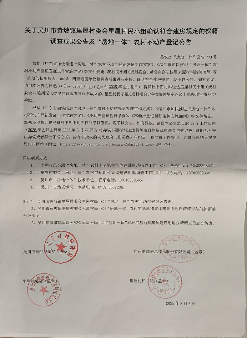 吴川市黄坡镇里屋村委会里屋村民小组确认符合建房规定的权籍调查成果公告及“房地一体”农村不动产登记公告