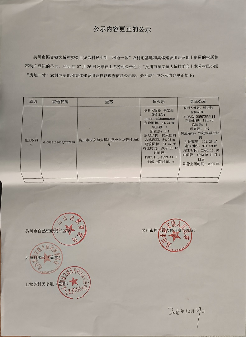 吴川市振文镇大桥村委会上龙芳村民小组公示内容更正的公告