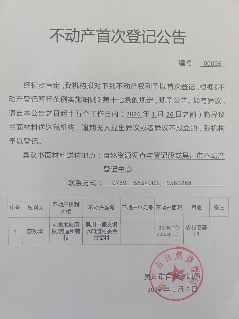 不动产首次登记公告(苏观华)宗地面积:93.96平方米、建筑面积:323.26平方米