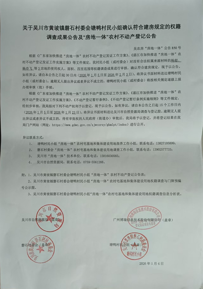 吴川市黄坡镇磐石村委会塘鸭村民小组确认符合建房规定的权籍调查成果公告及“房地一体”农村不动产登记公告