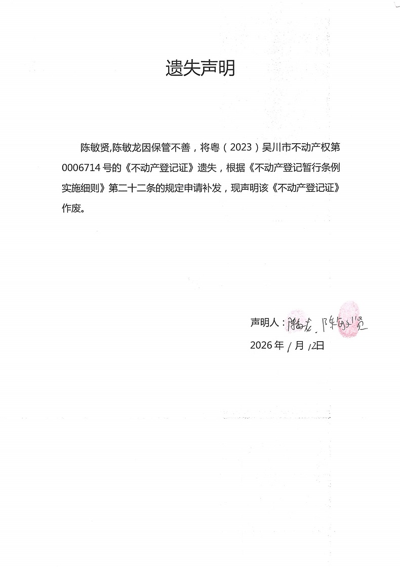 遗失声明(陈敏贤,陈敏龙)