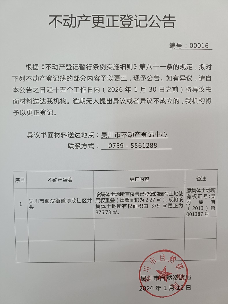 不动产更正登记公告(广东省吴川市海滨街道博茂社区井头经济合作社)宗地面积:376.73平方米