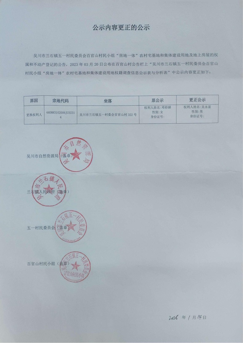 吴川市兰石镇五一村民委员会百官山村公示内容更正的公示