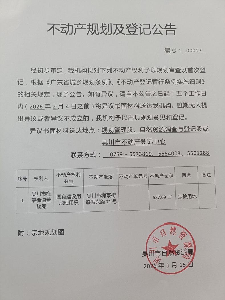 不动产规划及登记公告(吴川市梅菉街道普馝庵)宗地面积:573.69平方米