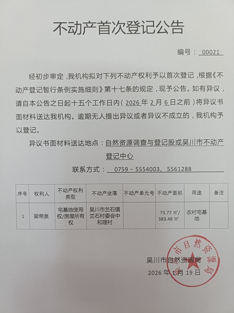 不动产首次登记公告(梁帝泉)宗地面积:73.77平方米、建筑面积:383.48平方米